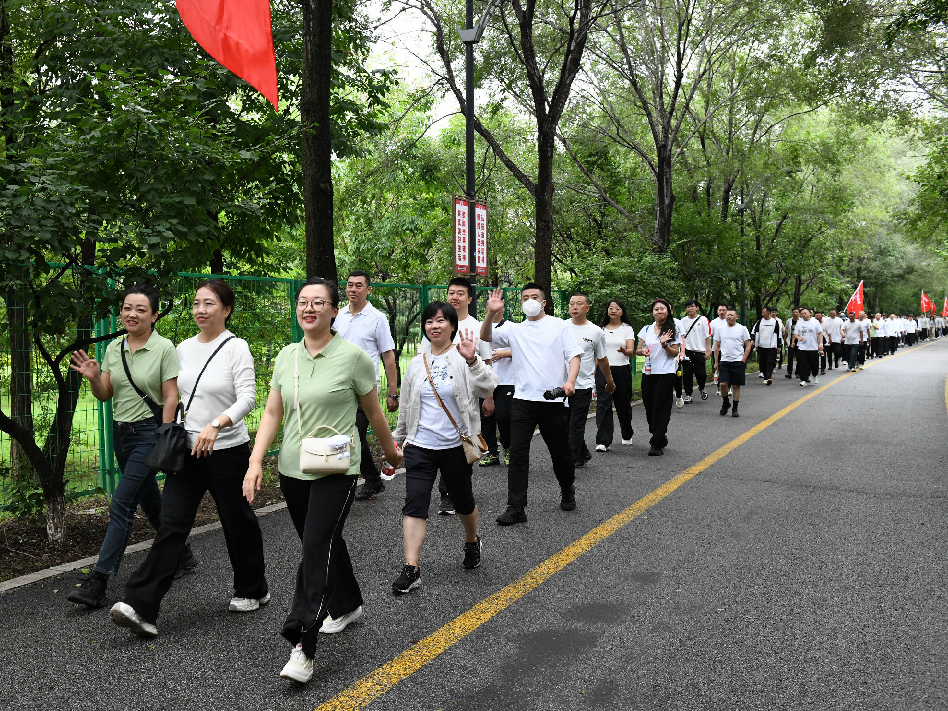 撫順特鋼第一副總經理穆立峰為員工徒步健康行活動發(fā)令。伴隨著發(fā)令聲,公司領導與400余名員工圍繞月牙島開始5公里徒步健康行。一路上,大家揮舞隊旗、彩旗踏歌而行,每個人的臉上都洋溢著幸福的笑容。經過一個多小時的努力,所有人都勝利到達終點。