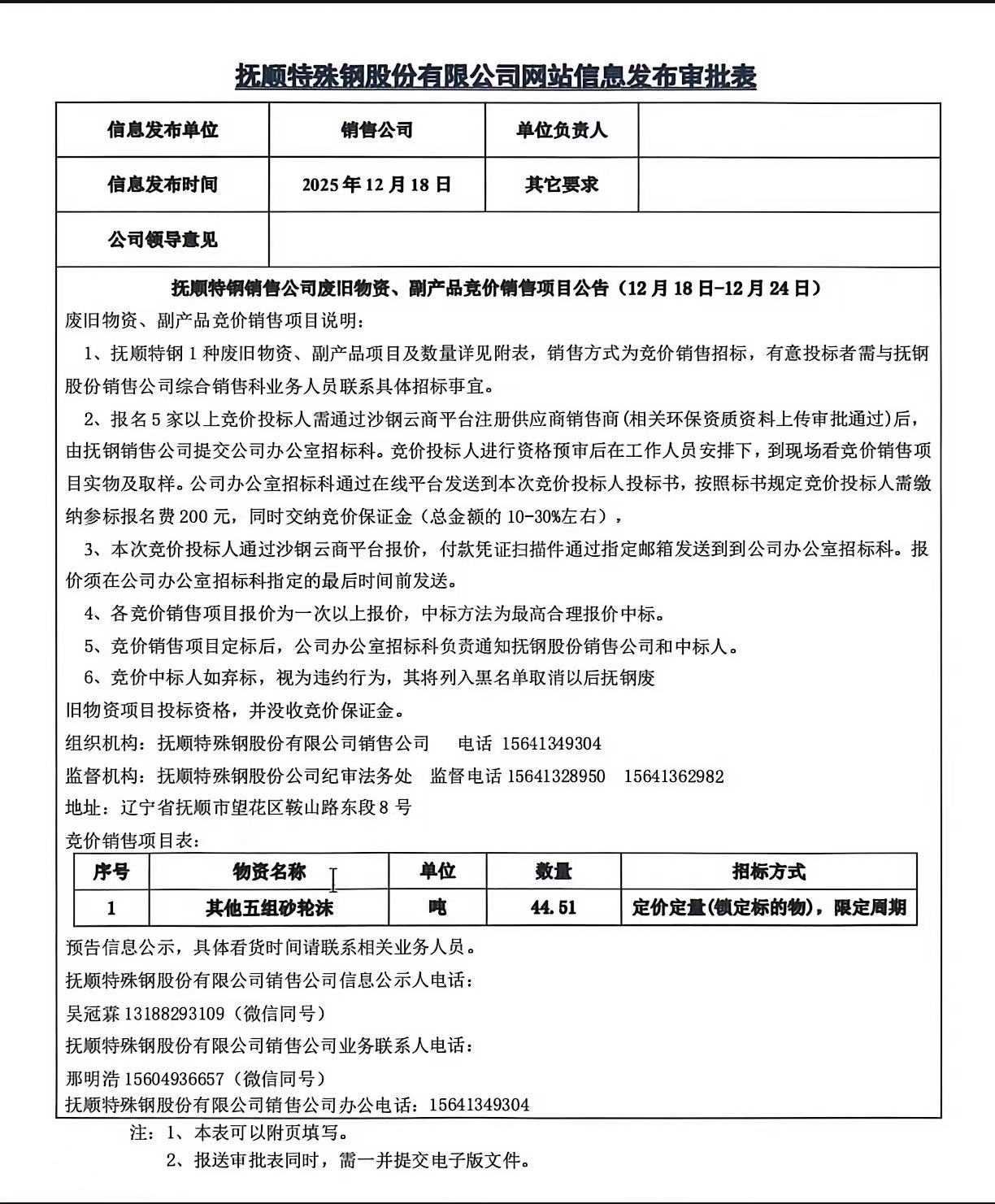 撫順特鋼銷售公司廢舊物資、副產(chǎn)品競價(jià)銷售項(xiàng)目公告(12月18日-12月24日)