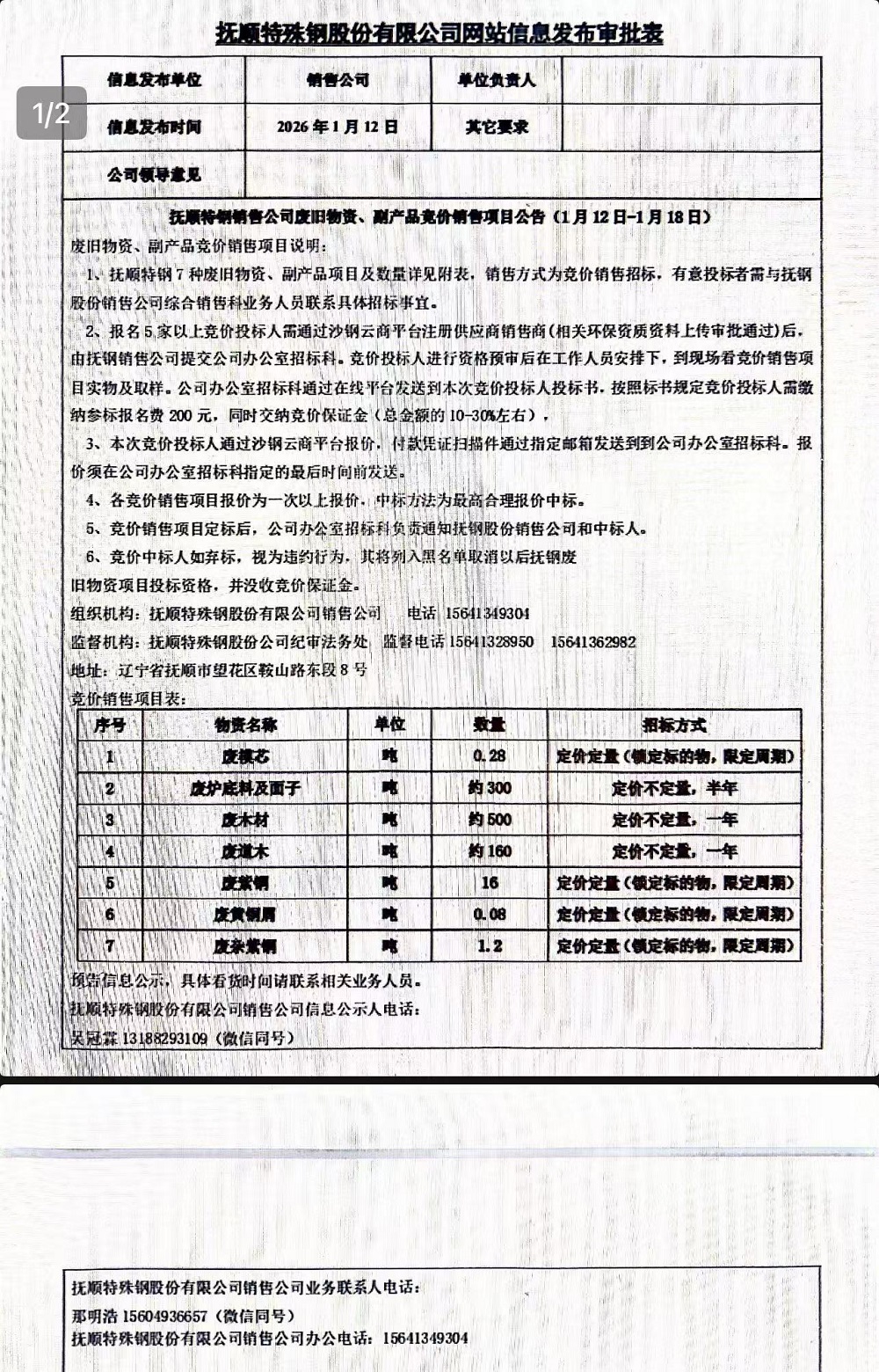 撫順特鋼銷售公司廢舊物資、副產(chǎn)品競價銷售項目公告(1月12日-1月18日)