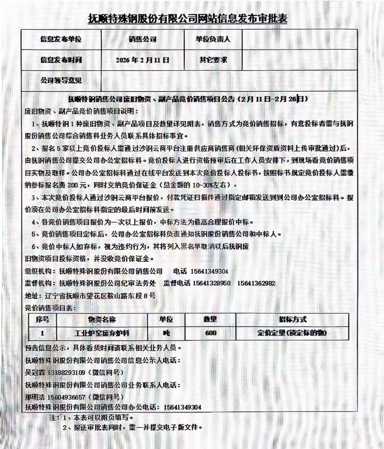 撫順特鋼銷售公司廢舊物資、副產(chǎn)品競(jìng)價(jià)銷售項(xiàng)目公告(2月11日-2月26日)